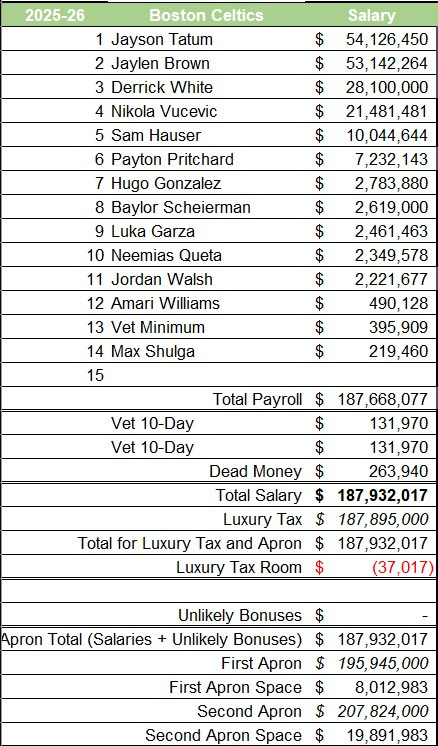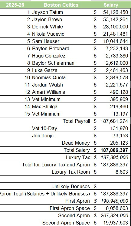 The Celtics were $1.3 million under the luxury tax threshold with just 11 players after trading Tillman, Minott, and Boucher. So they filled their 12th roster spot with Amari Williams, their 2025 second-round selection who was on a two-way contract. They chose him over a veteran because he costs less on their cap sheet than any other player.