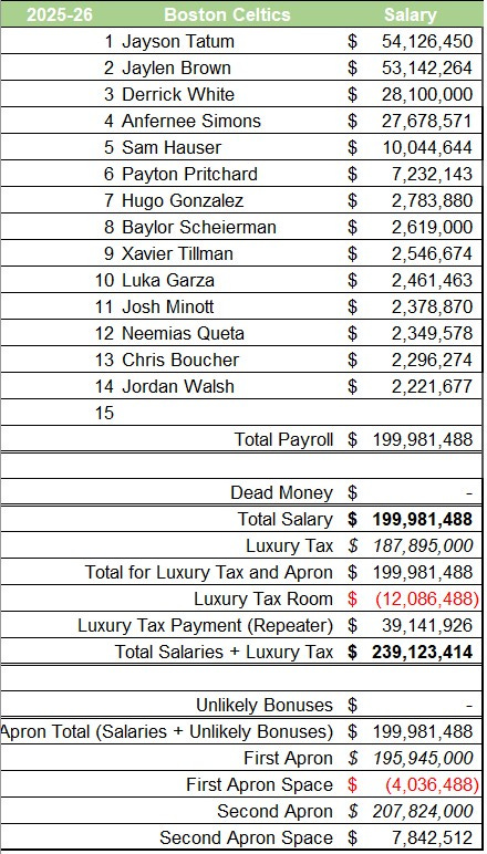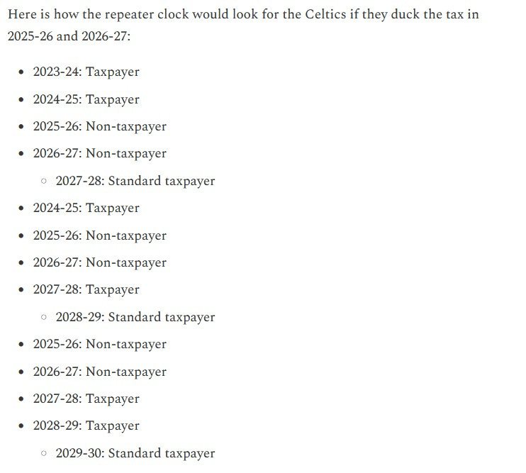 The Celtics need to avoid the luxury tax both in 2025-26 and 2026-27 to reset their repeater clock. Doing so would make them standard taxpayers from 2027-28, when Tatum will be two years removed from his injury, through 2029-30. This would give the Celtics a three-year window at the end of the decade to blow past the aprons and spend as much as possible. That is their true window to compete for a championship, not now.
