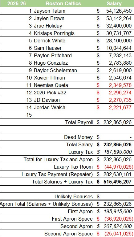 The 2025-26 Celtics would’ve cost over half a billion dollars to run back the roster. That’s why their offseason was all about subtraction. They traded Jrue Holiday for Anfernee Simons. They traded Kristaps Porzingis for Georges Niang, and then two second-round picks to get off him. The only other additions to their roster were minimum signings and their first-round pick (Hugo Gonzalez).