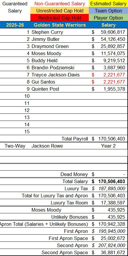 The Warriors currently have $170.5 million in team salaries for nine players. They will likely operate above the first apron, so they’d have an additional $11.9 million to spend on the roster. That will be necessary to field a deep roster with two players making above the 35 percent maximum.