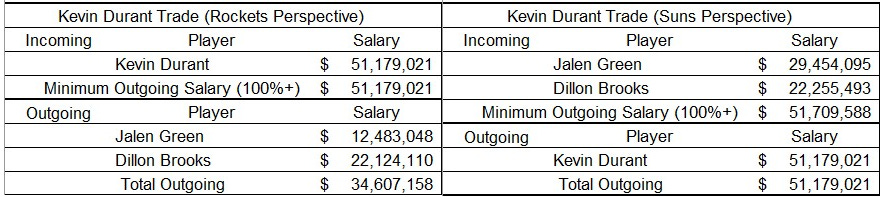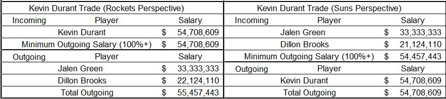 Usually, that’s only an issue for the team receiving the player. But in this case, it’s also a problem for the Rockets. PPP doesn’t change the outgoing salary from their perspective. Green’s $12.5 million salary, along with Brooks’ $22.1 million salary, isn’t enough to match Durant’s $51.2 million salary. Thus, the trade won’t work in 2024-25.