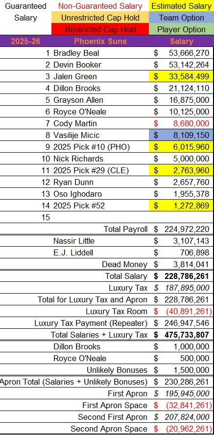 The Suns technically increase their projected payroll by acquiring the 10th overall selection, but not exactly by $6 million. It will mostly offset veteran minimum salaries of the two roster spots they gained by trading one player for three. They went further above the $207.8 million second apron, but they are realistically much closer to that threshold than their cap sheet suggests.