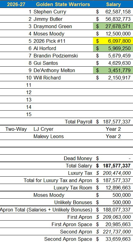 It’s worth noting that these projections factor in the player options of Draymond Green, Al Horford, and De’Anthony Melton. Melton seems like a lock to decline his minimum option, while Green and Horford are more likely to pick theirs up. If they do, the apron projections mentioned earlier are still relatively accurate.